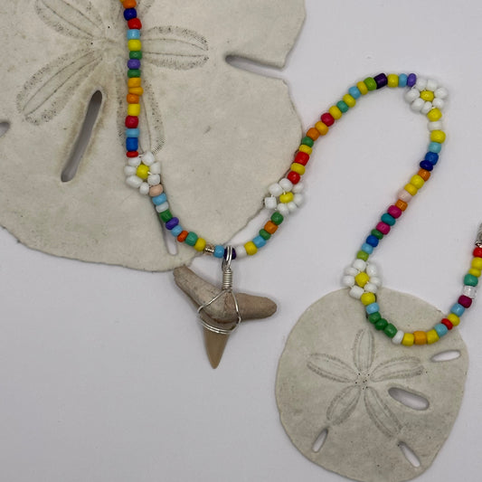 Shark Tooth on Rainbow Colorful Flower Beaded Necklace