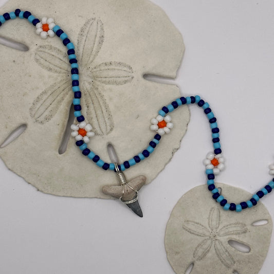 Shark Tooth on Blue Colorful Flower Beaded Necklace