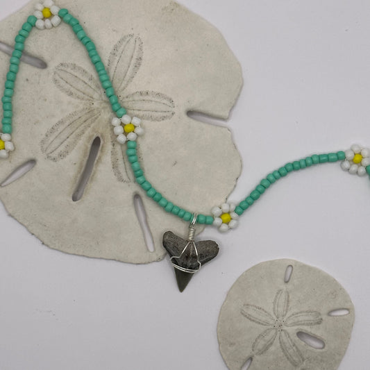Shark Tooth on Seafoam Green Flower Beaded Necklace