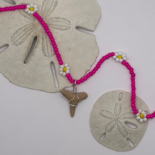 Shark Tooth on Pink Flower Beaded Necklace